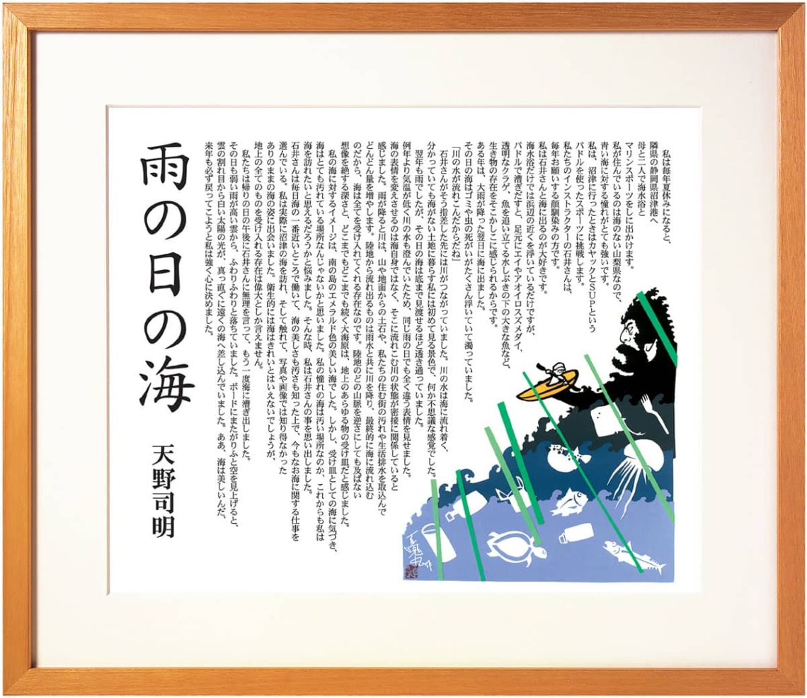 私は毎年夏休みになると、隣県の静岡県沼津港へ母と二人で海水浴とマリンスポーツをしに出かけます。私が住んでいるのは海のない山梨県なので、青い海に対する憧れがとても強いです。私は、沼津に行ったときはカヤックとSUPというパドルを使ったスポーツに挑戦します。私たちのインストラクターの石井さんは、毎年お願いする顔馴染みの方です。私は石井さんと海に出るのが大好きです。海水浴だけでは浜辺の近くを浮いているだけですが、パドルで漕ぎだすと、足元にエイやアオイロスズメダイ、透明なクラゲ、魚を追い立てる水しぶきの下の大きな魚など、生き物の存在をそこかしこに感じられるからです。ある年は、大雨が降った翌日に海に出ました。その日の海はゴミや虫の死がいがたくさん浮いていて濁っていました。