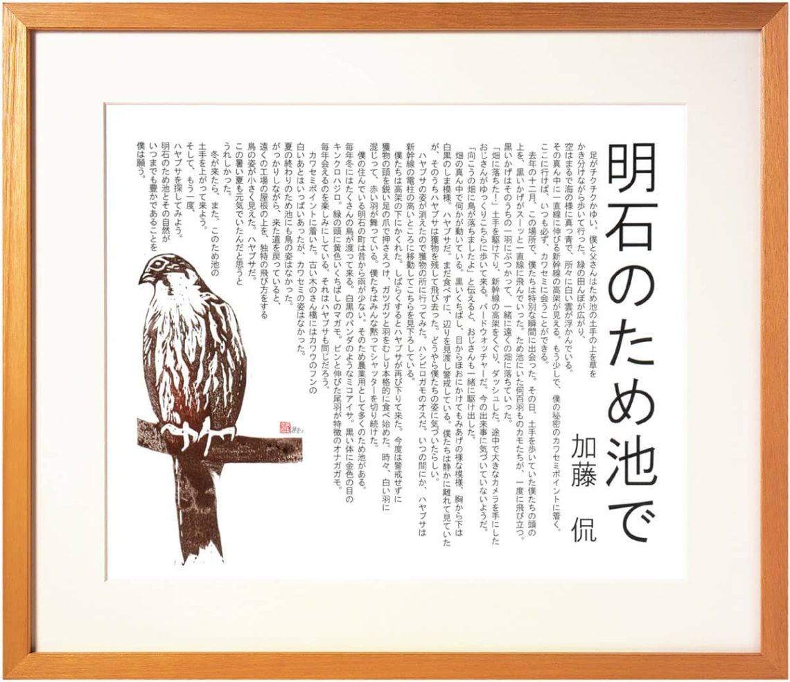 僕の住んでいる明石の町は昔から雨が少ない。そのため農業用として多くのため池がある。毎年冬にはたくさんの鳥が渡って来る。白黒のパンダのようなミコアイサ。黒い体に金色の目のキンクロハジロ。緑の頭に黄色いくちばしのマガモ。ピンと伸びた尾羽が特徴のオナガガモ。毎年会えるのを楽しみにしている。それはハヤブサも同じだろう。