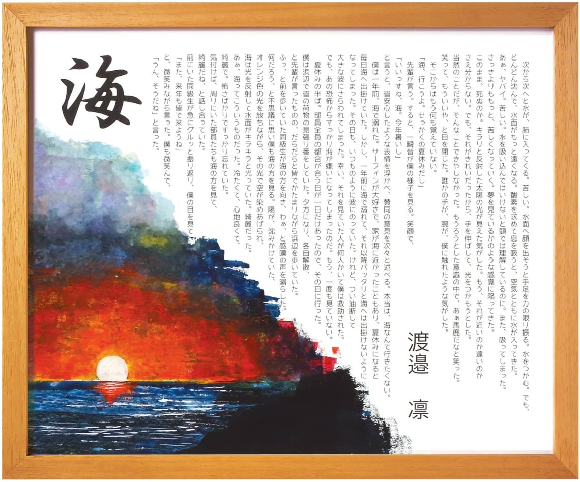 夏休みの半ば。部員全員の都合が合う日が一日だけあったので、その日に行った。僕は浜辺で皆の荷物の見張り番をしていた。夕方になり、各自解散、と先輩が言ったものの、だらだらと皆でかたまりながら浜辺を歩いていた。ふっ、と前を歩いていた同級生が海の方を向き、わぁ、と感嘆の声を漏らした。何だろう、と不思議に思い僕も海の方を見る。陽が、沈みかけていた、オレンジ色の光を放ちながら、その光で空が染めあげられ、海は光を反射して水面がキラキラと光っていた。綺麗だった。あぁ、海ってこういうものだった。冷たくて、心地良くて、綺麗で。怖さばかりですっかり忘れていた。気付けば、周りにいた部員たちも海の方を見て、綺麗だね、と話し合っていた。前にいた同級生が急にグルッと振り返り、僕の目を見て、