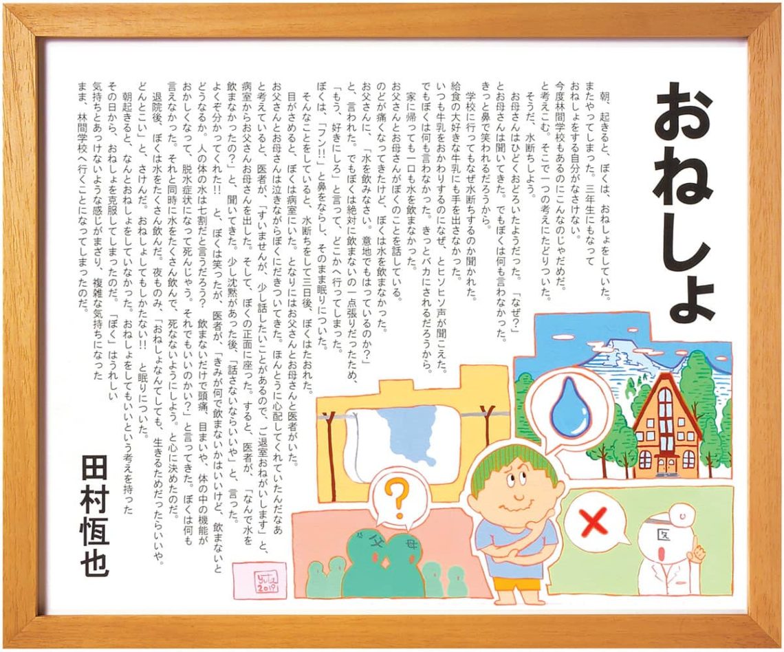朝、起きると、ぼくは、おねょをしていた。またやってしまった。三年生にもなっておねしょをする自分がなさけない。今度林間学校もあるのにこんなのじゃだめだ。と考えこむ。そこで一つの考えにたどりついた。