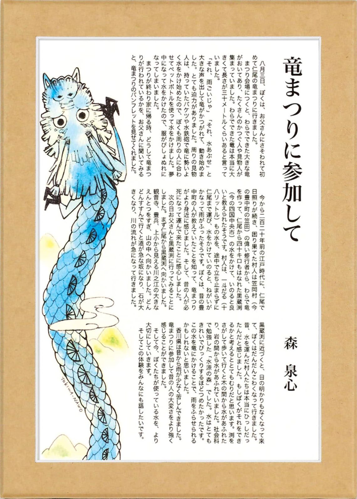 今から二百二十年前の江戸時代に、仁尾でに日照りが続き、困り果てた村人は笠岡村(今の豊中町の笠田)の偉い修行者から、わらで竜を作って、仁尾から四十キロもはなれた黒蔵渕(今の四国中央市)の水をかけて、いのると良いと教えられたそうです。村人は、一斗だる(十八リットル)もの水を、途中で立ち止まらずに仁尾まで運び、水をかけていのると、ねがいがかなって雨がふったそうです。ぼくは、昔の豊中町の人が教えていたことを知って、竜まつりがより身近に感じました。そして、昔の人が必死になって運んで来たことに感心しました。