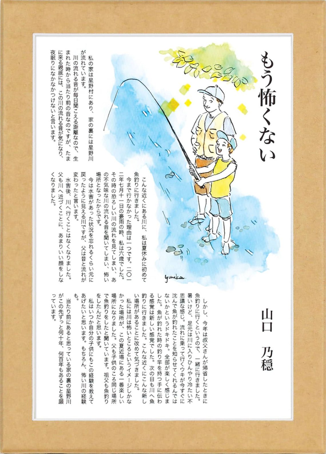 水害後、川へ行くことはなくなりました。父も川へ近づくことに、あまりいい顔をしなくなりました。しかし、今年は叔父さんが帰省したときに魚釣りに行くというので、一緒に行きました。暑いけど、足元は川に入りひんやり冷たい不思議な感じ。流れに乗って行くウキが今すぐに沈んで魚が釣れたことを知らせてくれるんではないかというドキドキ。全部が楽しく感じました。魚が釣れた時の釣り竿を持つ手に伝わる感覚は新しい感覚でした。次の日も川へ魚釣りに行きました。こんな近くにこんな新しい場所があることに改めて気づきました。