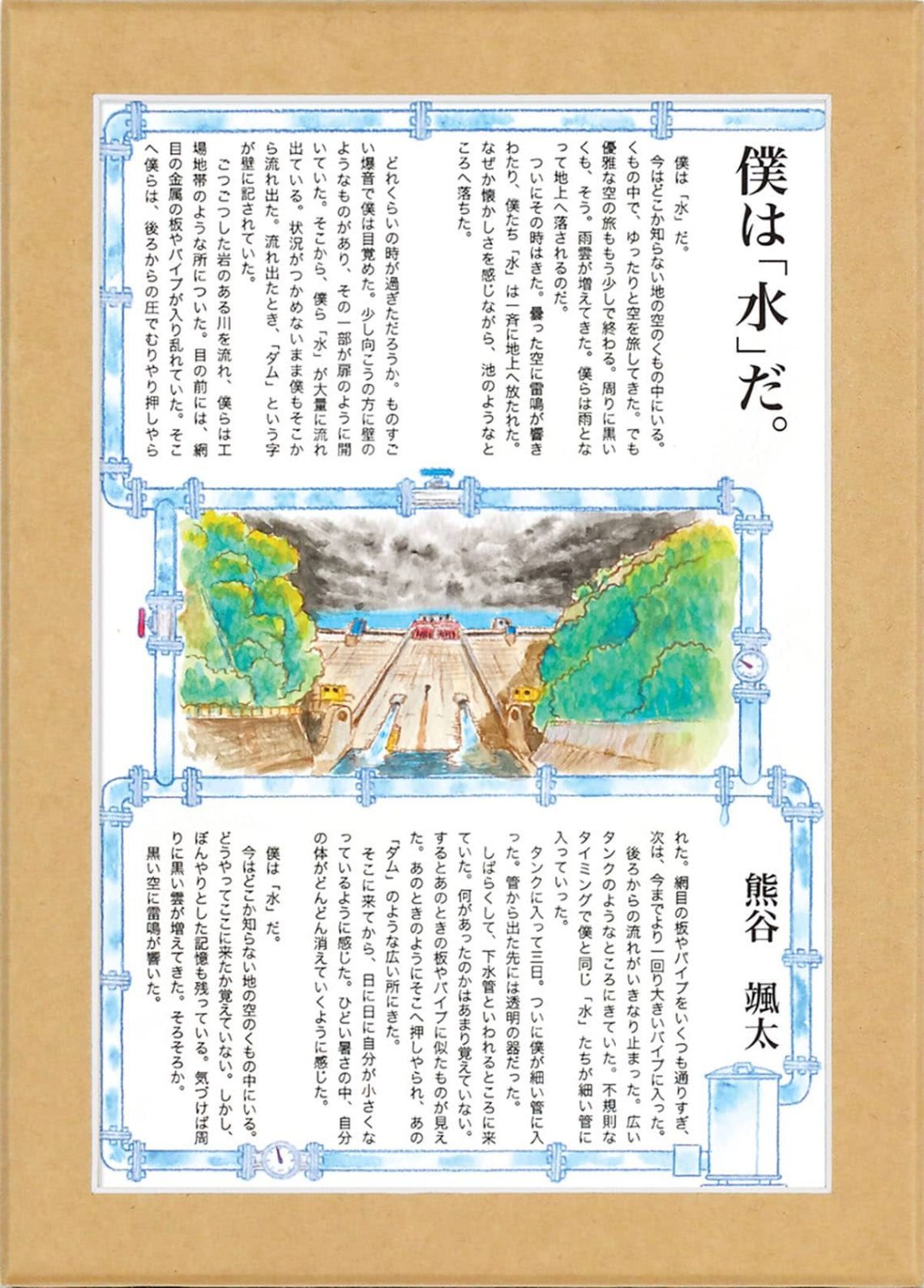どれくらいの時が過ぎただろうか。ものすごい爆音で僕は目覚めた。少し向こうの方に壁のようなものがあり、その一部が扉のように開いていた。そこから、僕ら「水」が大量に流れ出ている。状況がつかめないまま僕もそこから流れ出た。流れ出たとき、「ダム」という字が壁に記されていた。