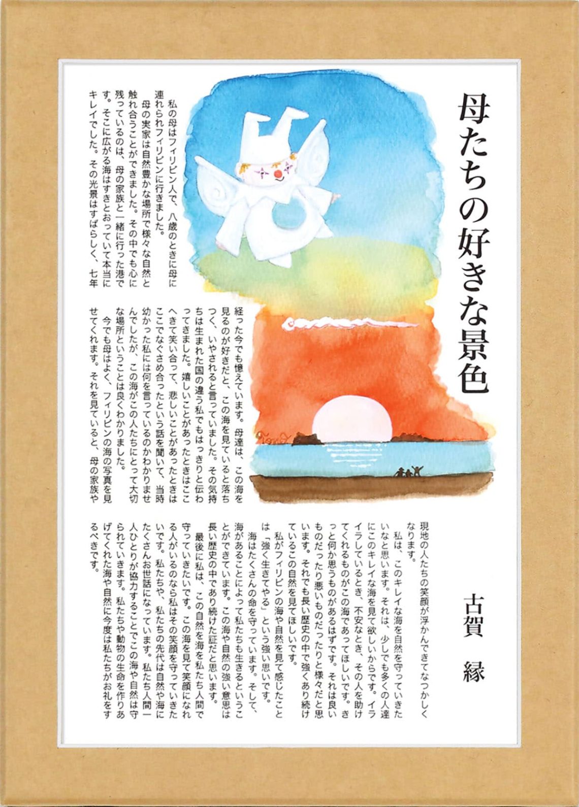 母の実家は自然豊かな場所で様々な自然と触れ合うことができました。その中でも心に残っているのは、母の家族と一緒に行った港です。そこに広がる海はすきとおっていて本当にキレイでした。その光景はすばらしく、七年経った今でも憶えています。母達は、この海を見るのが好きだと、この海を見ていると落ちつく、いやされると言っていました。その気持ちは生まれた国の違う私でもはっきりと伝わってきました。嬉しいことがあったときはここへきて笑い合って、悲しいことがあったときはここでなぐさめ合ったという話を聞いて、当時幼かった私には何を言っているのかわかりませんでしたが、この海がこの人たちにとって大切な場所ということは良くわかりました。