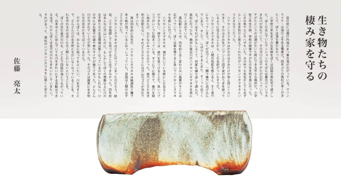 ぼくの住む金沢の川も、どこかで四国の海とつながっている。日本中どこに住んでいても川をきれいにする活動はできるはず。だからぼくは金沢の川からきれいにしていきたい。それがきっと、高松のハクセンシオマネキに届くと思うから。