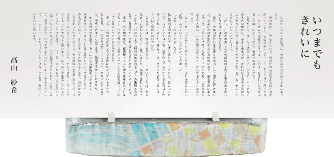 川の水は、とてもきれいで、川の底の石が見えるほど透き通っています。太陽の光が当たって、キラキラと輝く光景は、たくさんの宝石のようです、このようなきれいな川があることは、私にとっては、矢部村の自まんです。
