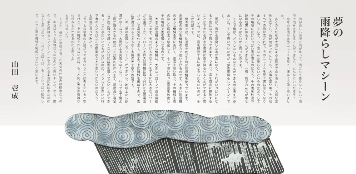 そうか、僕が小学校で習った天気の仕組みは簡単なもので、本当はもっと複雑なものなのかと思いました。でも、僕の「夢の雨降らしマシーン」ができたら本当に地球のためになると思うので、これからぼくは、もっといっぱい勉強して、いつか夢の機械を完成させたいと思います。