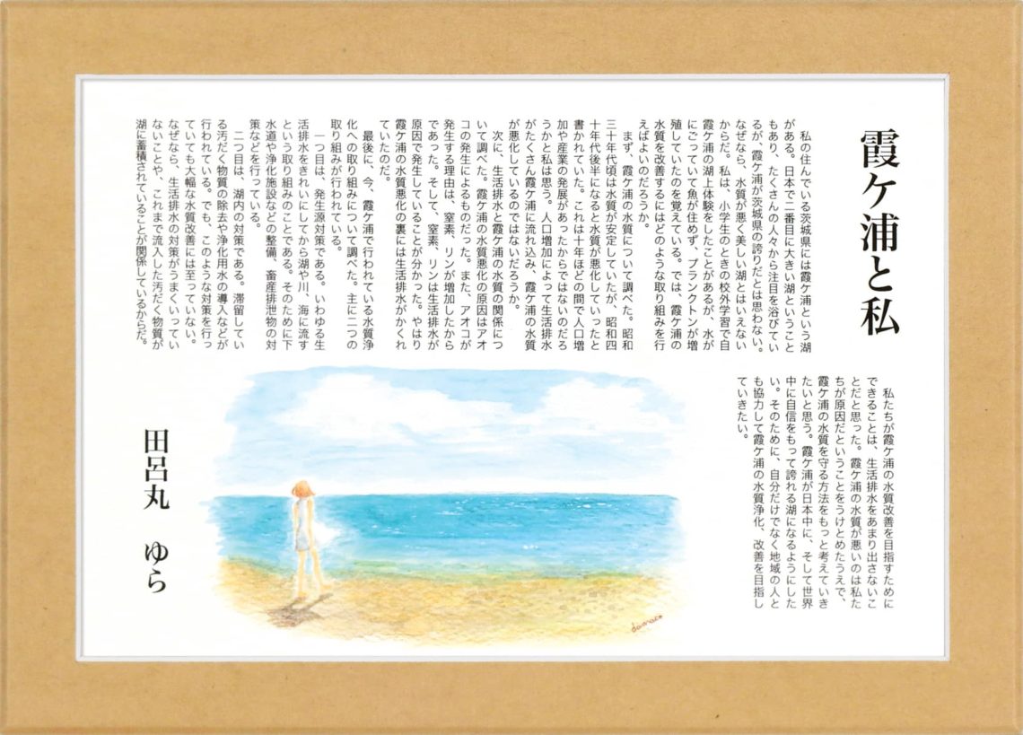 私たちが霞ケ浦の水質改善を目指すためにできることは、生活排水をあまり出さないことだと思った。霞ケ浦の水質が悪いのは私たちが原因だということをうけとめたうえで、霞ケ浦の水質を守る方法をもっと考えていきたいと思う。霞ケ浦が日本中に、そして世界中に自信をもって誇れる湖になるようにしたい。そのために、自分だけでなく地域の人とも協力して霞ケ浦の水質浄化、改善を目指していきたい。