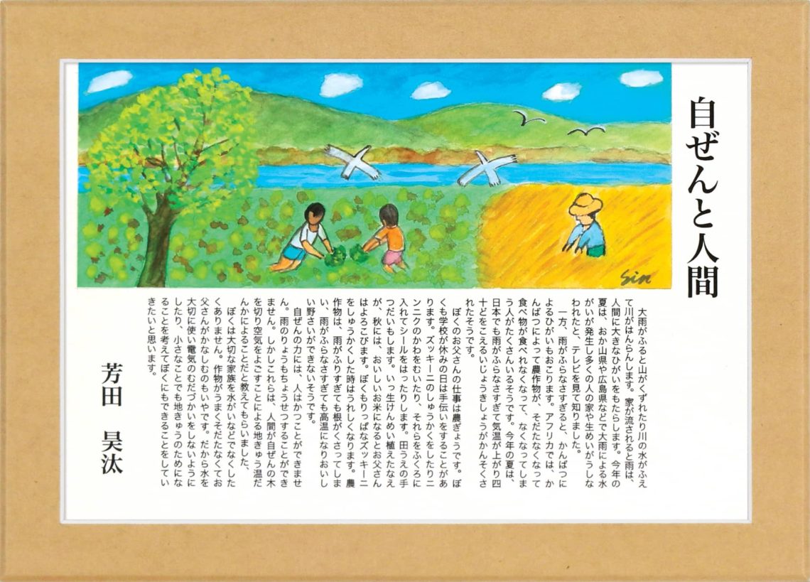 ぼくは大切な家族を水がいなどでなくしたくありません。作物がうまくそだたなくてお父さんがかなしむのもいやです。だから水を大切に使い電気のむだづかいをしないようにしたり、小さなことでも地きゅうのためになることを考えてぼくにもできることをしていきたいと思います。