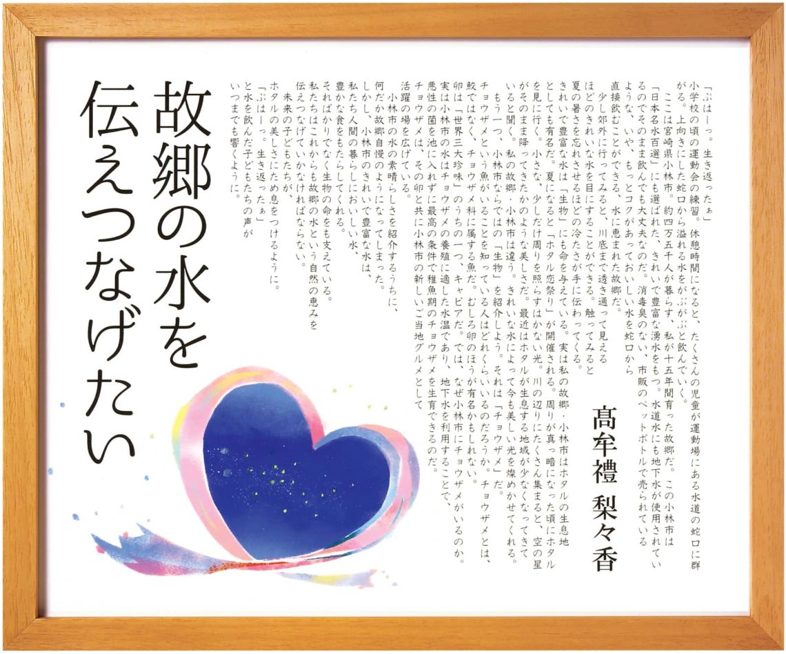 小林市の水の素晴らしさを紹介するうちに、何だか故郷自慢のようになってしまった。しかし、小林市のきれいで豊富な水は、私たち人間の暮らしにおいしい水、豊かな食をもたらしてくれる。そればかりでなく生物の命をも支えている。私たちはこれからも故郷の水という自然の恵みを伝えつなげていかなければならない。