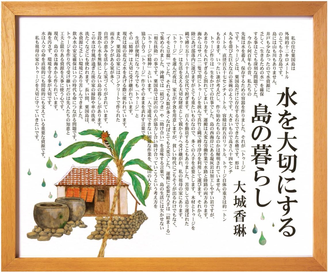 私の住む粟国島は外周約十二キロメートルのとても小さな島です。島には山も川もありません。井戸も少なかったので水資源に乏しく「生きるための水」を確保する事はとても深刻な問題でした。