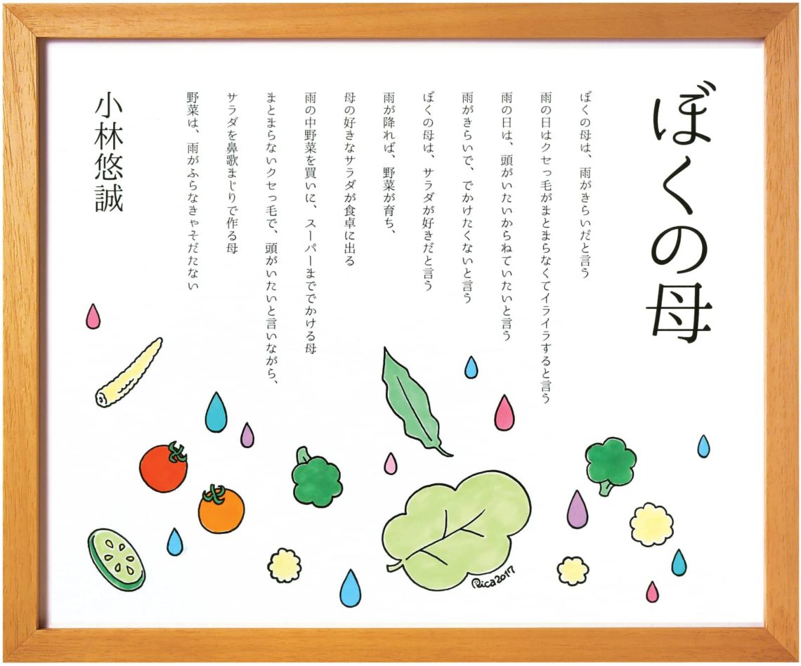 2017年度受賞作品, ARTIST, AWARD, 原田 リカ 【ざぶん文化賞】ぼくの母 2022年7月14日 ぼくの母は、雨がきらいだと言う 雨の日はクセっ毛がまとまらなくてイライラすると言う 雨の日は、頭がいたいからねていたいと言う 雨がきらいで、でかけたくないと言う ぼくの母は、サラダが好きだと言う 雨が降れば、野菜が育ち、 母の好きなサラダが食卓に出る 雨の中野菜を買いに、スーパーまででかける母 まとまらないクセっ毛で、頭がいたいと言いながら、 サラダを鼻歌まじりで作る母 野菜は、雨がふらなきゃそだたない 前 【特別賞】雨水の利用 最近 【ざぶん大賞】海とおじいちゃんと僕 こちらもおすすめ 【特別賞】「水一日一リットル」大作戦が起こした奇跡 2022年9月1日 【特別賞】海の環境とゴミについて 2022年8月26日 【特別賞】ダム 2022年10月12日 コメントを残す コメントをキャンセルメールアドレスが公開されることはありません。 ※ が付いている欄は必須項目です名前 ※ メール ※ サイト 次回のコメントで使用するためブラウザーに自分の名前、メールアドレス、サイトを保存する。 コメント