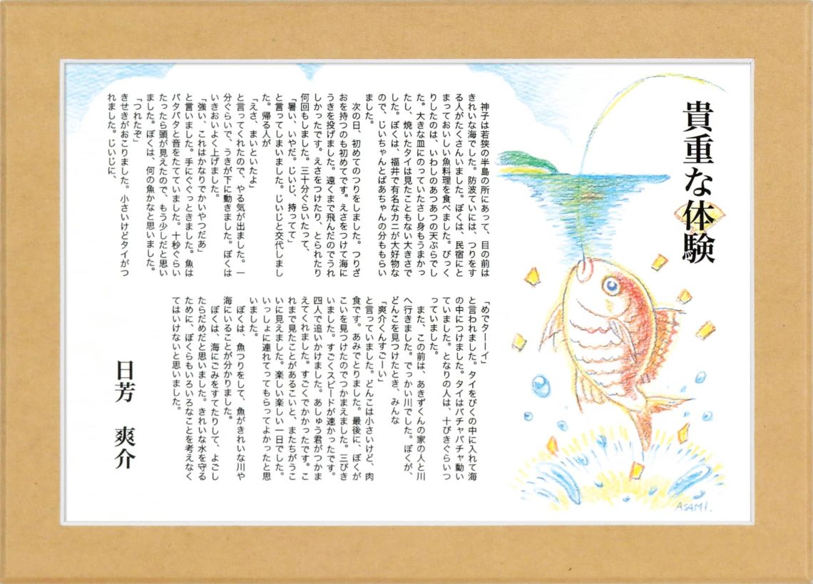 神子は若狭の半島の所にあって、目の前はきれいな海でした。防波ていには、つりをする人がたくさんいました。ぼくは、民宿にとまっておいしい魚料理を食べました。びっくりしたのは、いわしのあつあつの天ぷらでした。大きな皿にのっていたさし身もうまかったし、焼いたタイは見たこともない大きさでした。ぼくは、福井で有名なカニが大好物なので、じいちゃんとばあちゃんの分ももらいました。