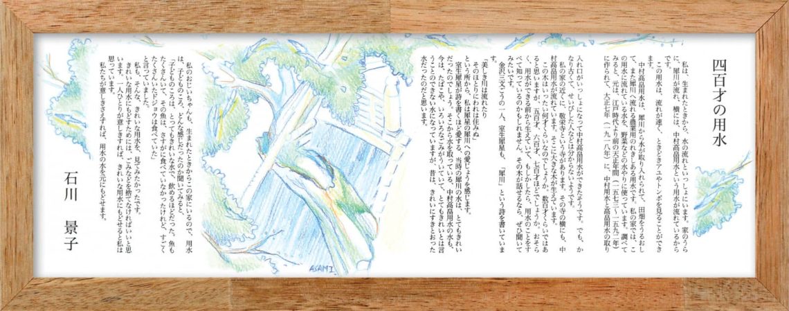 私は、生まれたときから、水の流れといっしょにいます。家のうらに、犀川が流れ、横には、中村高