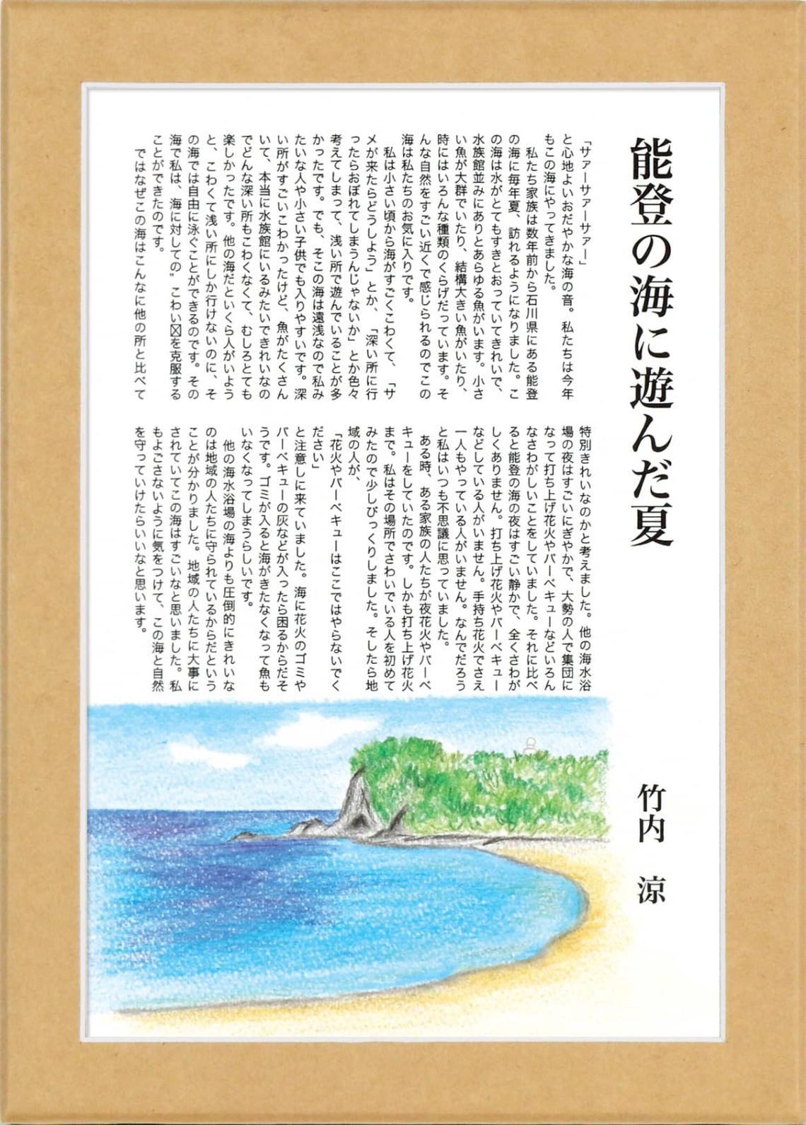 ではなぜこの海はこんなに他の所と比べて特別きれいなのかと考えました。他の海水浴場の夜はすごいにぎやかで、大勢の人で集団になって打ち上げ花火やバーベキューなどいろんなさわがしいことをしていました。それに比べると能登の海の夜はすごい静かで、全くさわがしくありません。打ち上げ花火やバーベキューなどしている人がいません。手持ち花火でさえ一人もやっている人がいません。なんでだろうと私はいつも不思議に思っていました。ある時、ある家族の人たちが夜花火やバーベキューをしていたのです。しかも打ち上げ花火まで。私はその場所でさわいでいる人を初めてみたので少しびっくりしました。そしたら地域の人が、