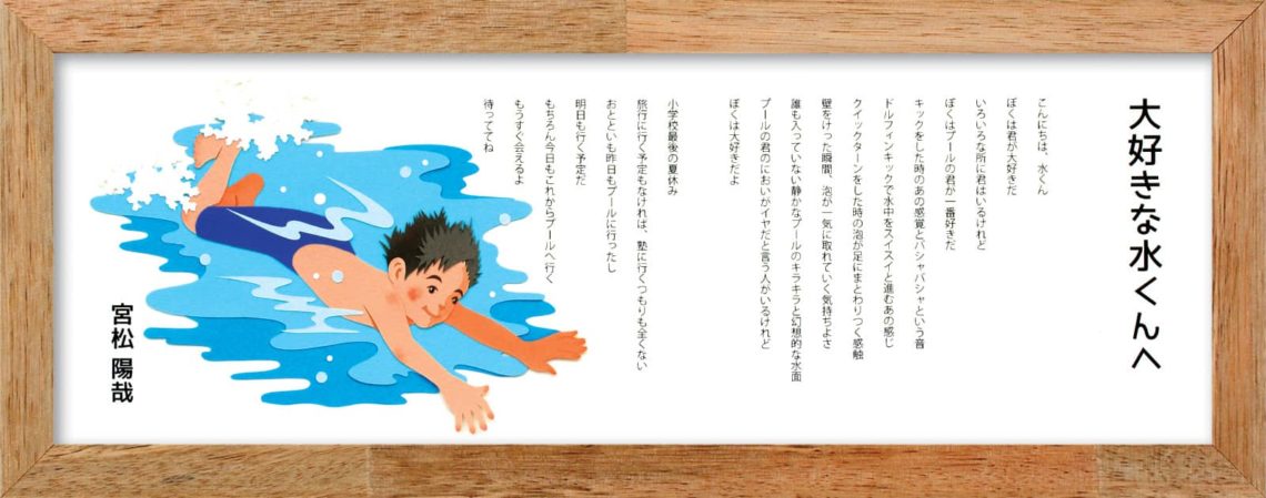 2016年度受賞作品, ARTIST, AWARD, 大村 斗喜子 【特別賞】大好きな水くんへ 2022年8月1日 こんにちは、水くん ぼくは君が大好きだ いろいろな所に君はいるけれど ぼくはプールの君が一番好きだ キックをした時のあの感覚とバシャバシャという音 ドルフィンキックで水中をスイスイと進むあの感じ クイックターンをした時の泡が足にまとわりつく感触 壁をけった瞬間、泡が一気に取れていく気持ちよさ 誰も入っていない静かなプールのキラキラと幻想的な水面 プールの君のにおいがイヤだと言う人がいるけれど ぼくは大好きだよ 小学校最後の夏休み旅行に行く予定もなければ、塾に行くつもりも全くない おとといも昨日も プールに行ったし 明日も行く予定だ もちろん今日もこれからプールへ行く もうすぐ会えるよ 待っててね 陽哉より 前 【特別賞】本栖湖の水のめぐみ 最近 【特別賞】魚とり こちらもおすすめ 【ざぶん文化賞】ひとしずくの水 2022年8月22日 【ざぶん環境賞】生き物を育むため池 2022年8月2日 【ざぶん文化賞】飲み物 2022年8月19日 コメントを残す コメントをキャンセルメールアドレスが公開されることはありません。 ※ が付いている欄は必須項目です名前 ※ メール ※ サイト 次回のコメントで使用するためブラウザーに自分の名前、メールアドレス、サイトを保存する。 コメント