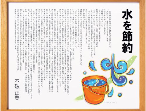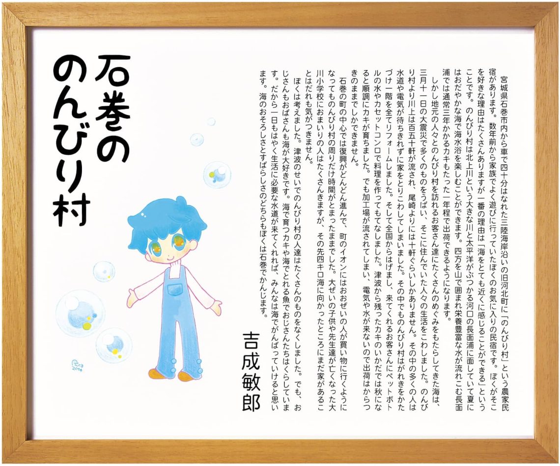 ぼくは考えました。津波のせいでのんびり村の人達はたくさんのものをなくしました。で も、おじさんもおばさんも海が大好きです。海で育つカキや海でとれる魚でおじさんたちは くらしています。だから一日もはやく生活に必要な水道が来てくれれば、みんなは海でがん ばっていけると思います。海のおそろしさとすばらしさのどちらもぼくは石巻でかんじます。