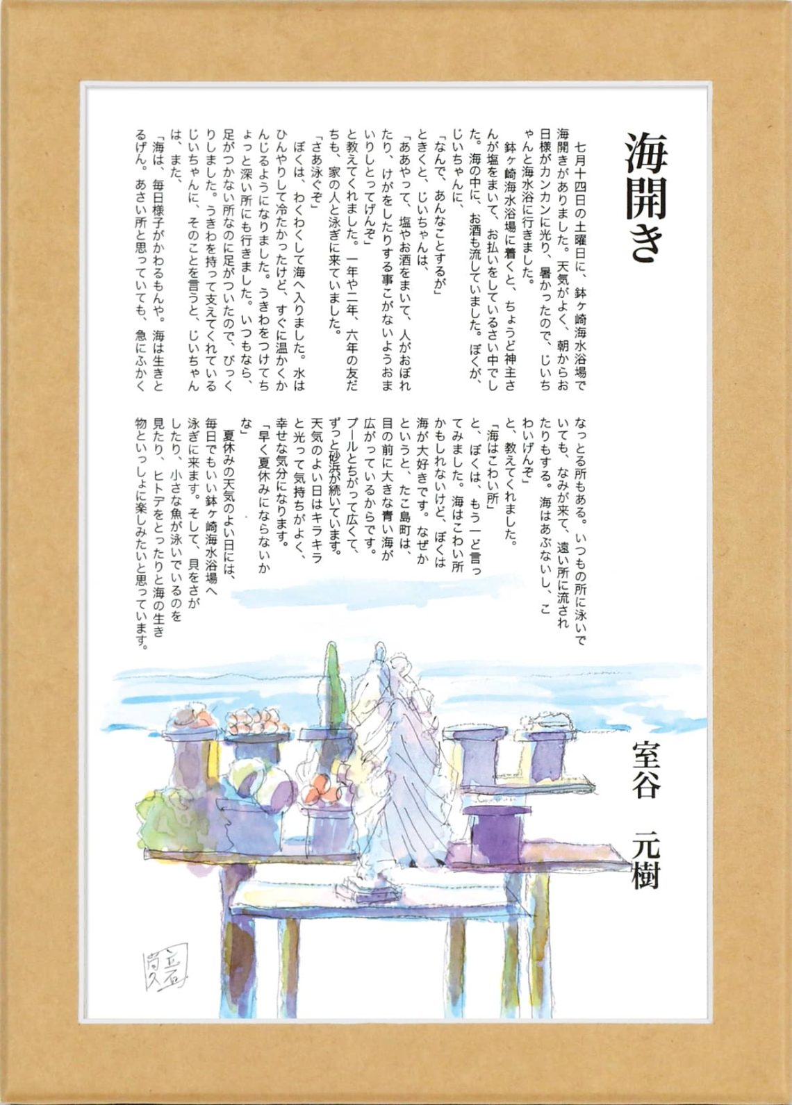ぼくは、わくわくして海へ入りました。水はひんやりして冷たかったけど、すぐに温かくかんじるようになりました。うきわをつけてちょっと深い所にも行きました。いつもなら、足がつかない所なのに足がついたので、びっくりしました。うきわを持って支えてくれているじいちゃんに、そのことを言うと、じいちゃんは、また、
