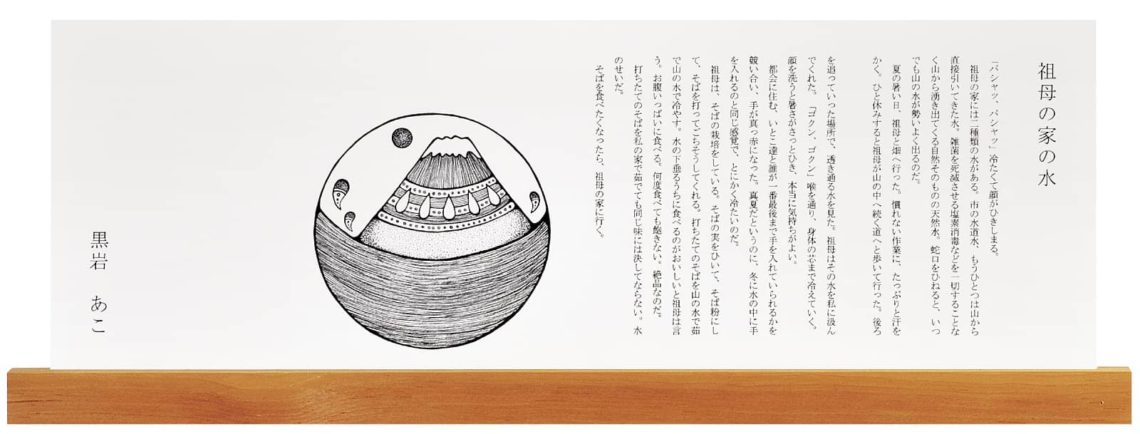 夏の暑い日、祖母と畑へ行った。慣れない作業に、たっぷりと汗をかく。ひと休みすると祖母が山の 中へ続く道へと歩いて行った。後ろを追っていった場所で、透き通る水を見た。祖母はその水を私に汲 んでくれた。「ゴクン、ゴクン」喉を通り、身体の芯まで冷えていく。顔を洗うと暑さがさっとひき、 本当に気持ちがよい。