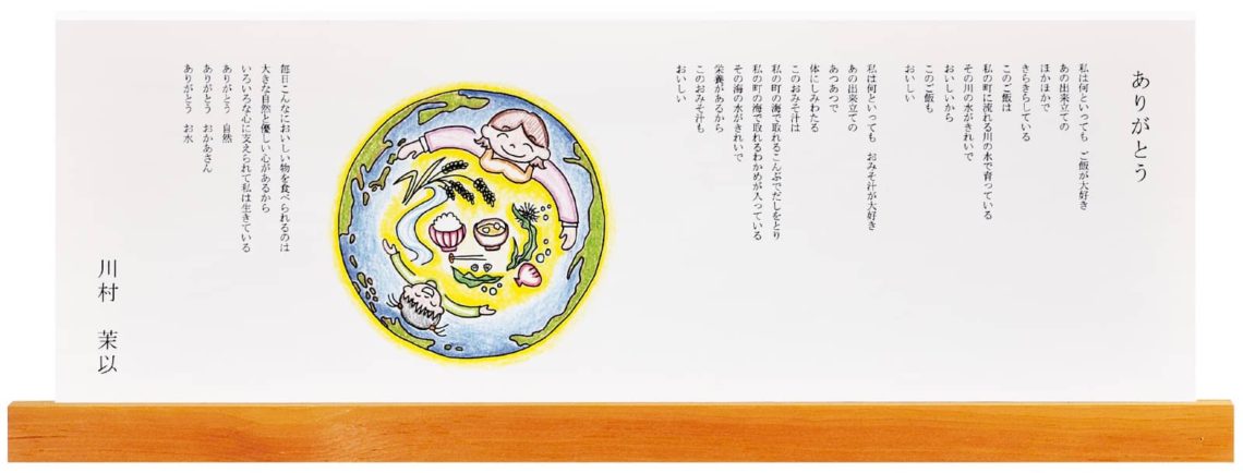 2013年度受賞作品, ARTIST, AWARD, 青山 恵 【特別賞】ありがとう 2022年8月17日 私は何といってもご飯が大好き あの出来立ての ほかほかで きらきらしている このご飯は私の町に流れる川の水で 育っている その川の水がきれいで おいしいから このご飯も おいしい私は何といってもおみそ汁が大好き あの出来立ての あつあつで 体にしみわたる このおみそ汁は 私の町の海で取れるこんぶでだしをとり 私の町の海で取れるわかめが入っている その海の水がきれいで 栄養があるから このおみそ汁も おいしい毎日こんなにおいしい物を食べられるのは 大きな自然と優しい心があるから いろいろな心に支えられて私は生きている ありがとう自然 ありがとうおかあさん ありがとうお水 前 【ざぶん環境賞】黒いあいつの正体 最近 【特別賞】どくぎょごんずい こちらもおすすめ 【奨励賞】地震で学んだ水の大切さ 2022年7月28日 【特別賞】母たちの好きな景色 2022年6月27日 【特別賞】海とシーグラス 2022年6月24日 コメントを残す コメントをキャンセルメールアドレスが公開されることはありません。 ※ が付いている欄は必須項目です名前 ※ メール ※ サイト 次回のコメントで使用するためブラウザーに自分の名前、メールアドレス、サイトを保存する。 コメント