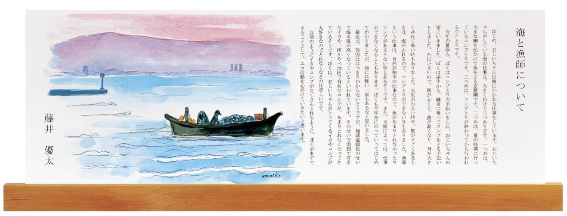 今年の夏休み、ぼくはコンブとりの手伝いをしに、おじいちゃんの家にいきました。ぼくは途中から、 磯舟に乗ってコンブをとる手伝いをしました。舟は小さいので、風がふくと、波が高くなり、舟が大き くゆれて怖い時もありました。天気がわるい時や、風がすごくあるときは、海があれるので、コンブと りができない日もありました。漁師という仕事は、自然が相手の仕事なので、魚があまりとれなかった りコンブがあまりない年もあるそうです。また、天候によっては、仕事ができなくなることもあります。 ぼくも今年舟にのっていってはじめてわかりましたが、海には怖い一面もあるなと思いました。 最近は、原因ははっきりわからないそうですが、地球温暖化のせいで海水温が高くなっているといわ