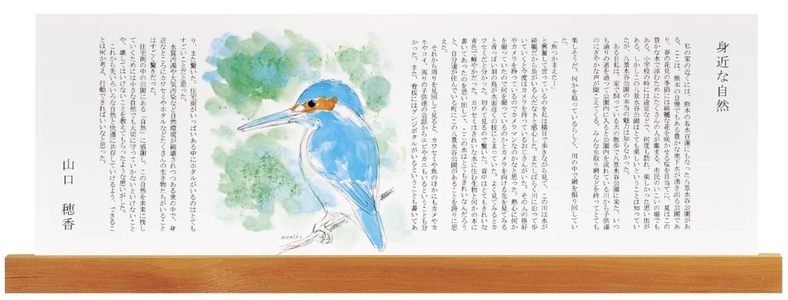 と興奮して言っているのを私は横目で歩きながら見て、この川は水が綺麗だから魚がいるんだなぁと 感心した。またしばらく川に沿って歩いていくと、今度はカメラを持っているおじさんがいた。その人 の格好やカメラを持っているのでカメラマンなのかなと思った。熱心に何かを撮っていたので何を撮っ ているのかとカメラを向ける先を見てみると、青っぽい羽の鳥が水面近くの枝にとまっていた。よく見 てみるとカワセミだと分かった。初めて見るので驚いた。背中はとてもきれいな青色で鮮やかだった。 カワセミはきれいな水に住む生物と何かの本に書いてあったのを思い出して、ここの水はとてもきれい なんだろうと、自分達が住んでいる町にこの八景水谷公園があることを誇りに思えた。