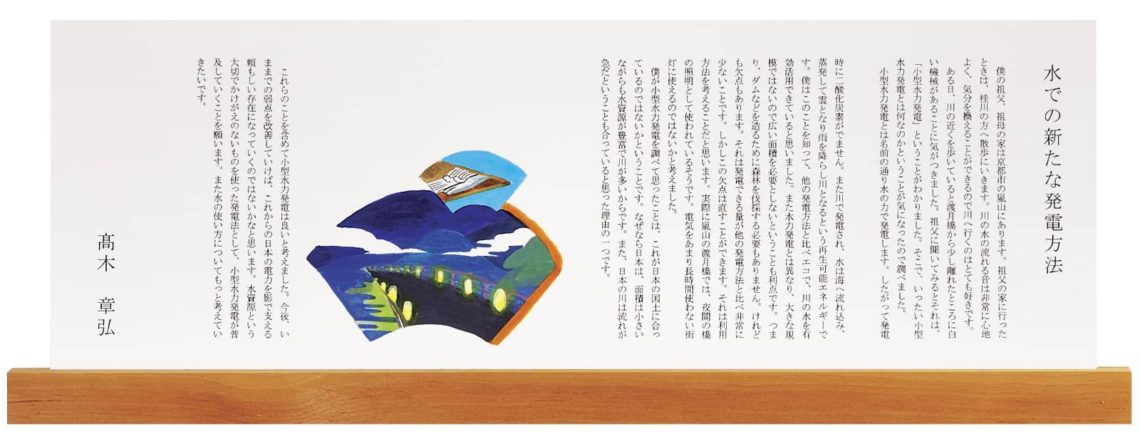 す。僕はこのことを知って、他の発電方法と比べエコで、川の水を有効活用できていると思いました。