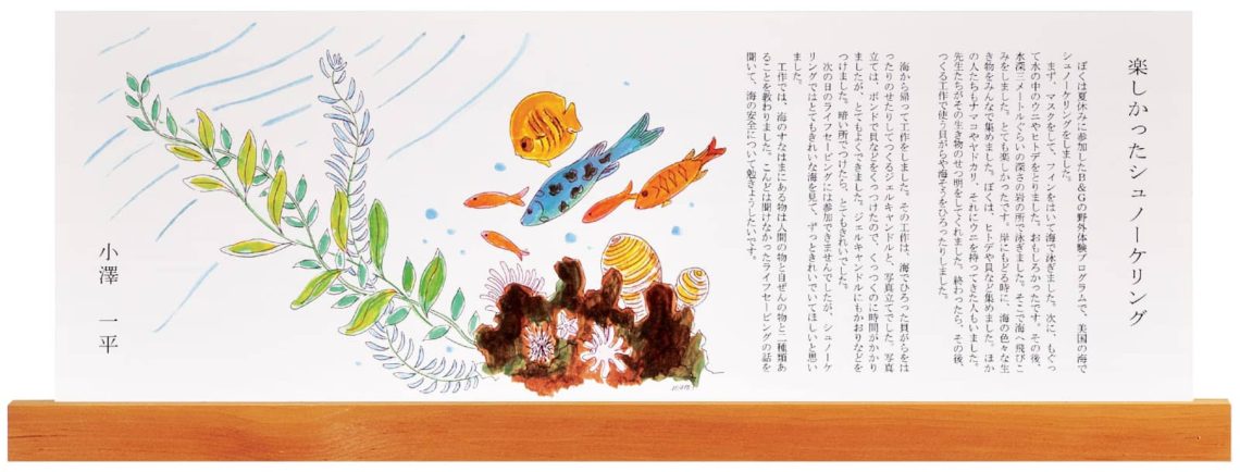 した。おもしろかったです。その後、水深三メートルぐらいの深さの岩の所で泳ぎました。そこで海へ飛 びこみをしました。とても楽しかったです。岸にもどる時に、海の色々な生き物をみんなで集めました。 ぼくは、ヒトデや貝など集めました。ほかの人たちもナマコやヤドカリ、それにウニを持ってきた人もい ました。先生たちがその生き物のせつ明をしてくれました。終わったら、その後、つくる工作で使う貝が らや海そうをひろったりしました。