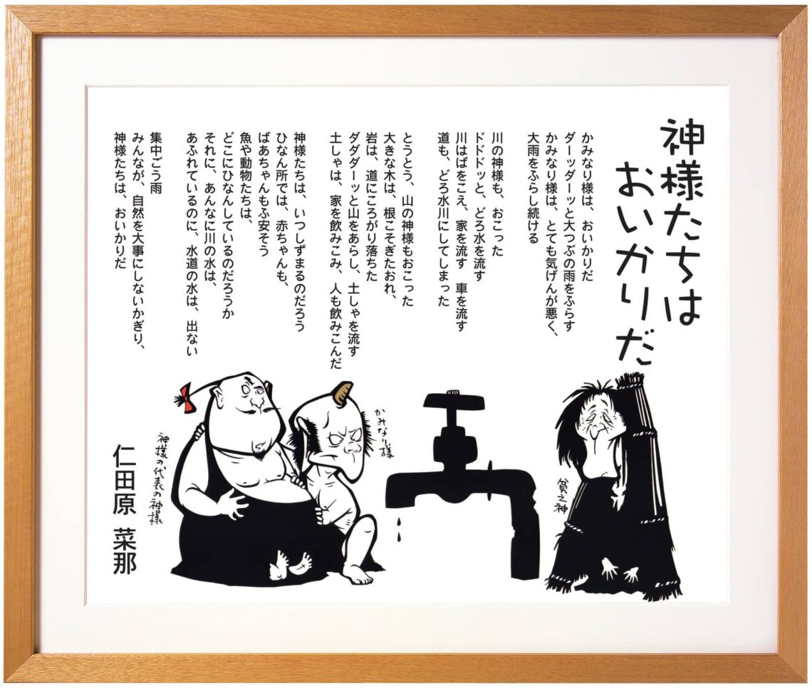 2012年度受賞作品, ARTIST, AWARD, 未分類, 百鬼丸 【準ざぶん大賞】神様たちはおいかりだ 2022年8月22日 かみなり様は、おいかりだ ダーッダーッと大つぶの雨をふらす かみなり様は、とても気げんが悪く、 大雨をふらし続ける 川の神様も、おこった ドドドッと、どろ水を流す 川はばをこえ、家を流す車を流す 道も、どろ水川にしてしまった とうとう、山の神様もおこった 大きな木は、根こそぎたおれ、 岩は、道にころがり落ちた ダダダーッと山をあらし、土しゃを流す 土しゃは、家を飲みこみ、人も飲みこんだ 神様たちは、いつしずまるのだろう ひなん所では、赤ちゃんも、 ばあちゃんもふ安そう 魚や動物たちは、 どこにひなんしているのだろうか それに、あんなに川の水は、 あふれているのに、水道の水は、出ない 集中ごう雨 みんなが、自然を大事にしないかぎり、 神様たちは、おいかりだ 前 【ざぶん文化賞】べんちょこ 最近 【準ざぶん大賞】水の汚れを取り除くために こちらもおすすめ 【特別賞】ごう雨さいがい 2022年6月6日 【ざぶん環境賞】いのちの宝箱 2022年7月26日 【準ざぶん大賞】水のこわさと大切さ 2022年8月17日 コメントを残す コメントをキャンセルメールアドレスが公開されることはありません。 ※ が付いている欄は必須項目です名前 ※ メール ※ サイト 次回のコメントで使用するためブラウザーに自分の名前、メールアドレス、サイトを保存する。 コメント