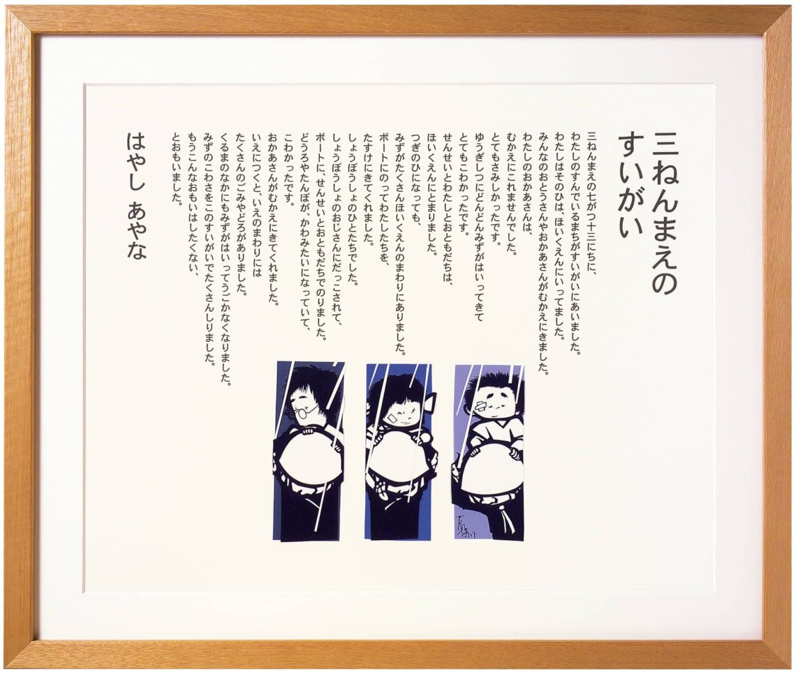 2007年度受賞作品, ARTIST, AWARD, 百鬼丸 【準ざぶん大賞】三ねんまえのすいがい 2022年8月25日 三ねんまえの七がつ十三にちに、 わたしのすんでいるまちがすいがいにあいました。 わたしはそのひは、ほいくえんにいってました。 みんなのおとうさんやおかあさんがむかえにきました。 わたしのおかあさんは、むかえにこれませんでした。とてもさみしかったです。ゆうぎしつにどんどんみずがはいってきて、とてもこわかったです。 せんせいとわたしとおともだちはほいくえんにとまりました。 つぎのひになってもみずがたくさんほいくえんのまわりにあ りました。 ぼうとにのってわたしたちをたすけにきてくれました。 しょうぼうしょのひとたちでした。 しょうぼうしょのおじさんにだっこされて、ボートに、せんせいとおともだちでのりました。 どうろやたんぼが、かわみたいになっていてこわかったです。 おかあさんがむかえにきてくれました。 いえにつくと、いえのまわりにはたくさんのごみやどろがありました。 くるまのなかにもみずがはいってうごかなくなりました。みずのこわさをこのすいがいでたくさんしりました。 もうこんなおもいはしたくない、とおもいました。 前 【準ざぶん大賞】木の気持ち 最近 【準ざぶん大賞】イモリと出会って学んだ事 こちらもおすすめ 【ざぶん環境賞】あの日の海 2022年10月5日 【特別賞】かけがえのない海 2022年9月6日 【特別賞】悪魔の水と天使の水 2022年7月8日 コメントを残す コメントをキャンセルメールアドレスが公開されることはありません。 ※ が付いている欄は必須項目です名前 ※ メール ※ サイト 次回のコメントで使用するためブラウザーに自分の名前、メールアドレス、サイトを保存する。 コメント