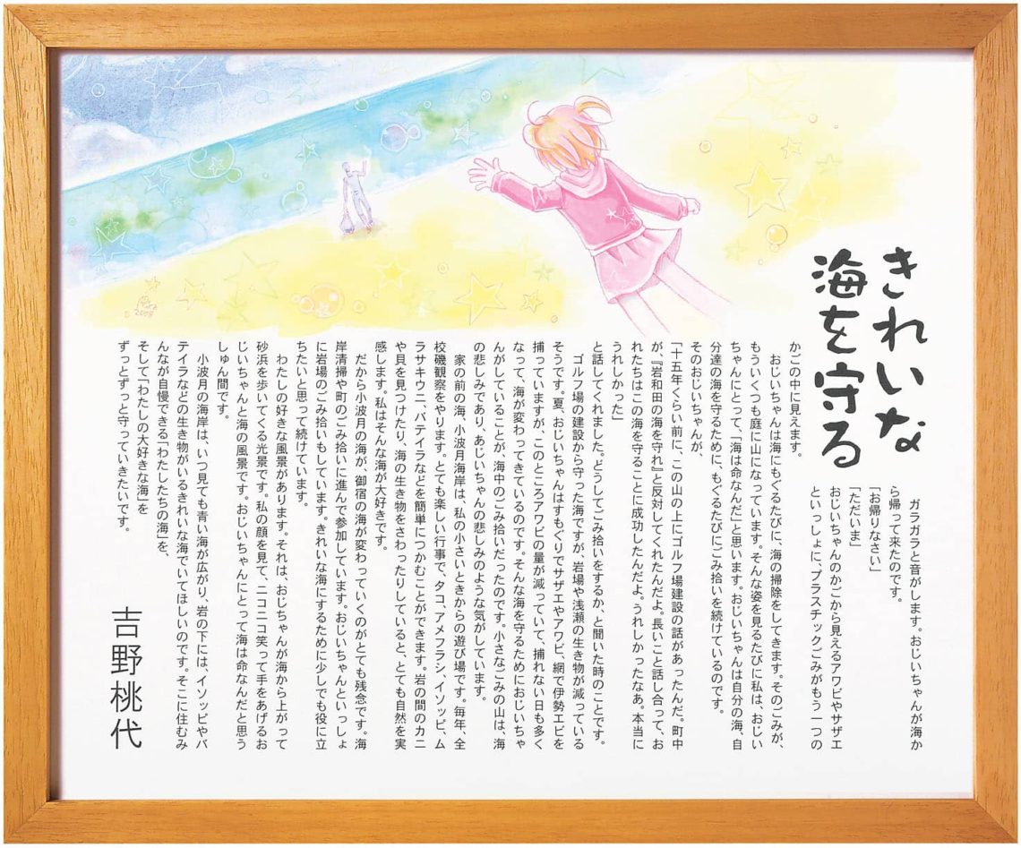 だから小波月の海が、御宿の海が変わっていくのがとても残念です。海岸清掃や町のごみ 拾いに進んで参加しています。おじいちゃんといっしょに岩場のごみ拾いもしています。きれいな海にするために少しでも役に立ちたいと思って続けています。