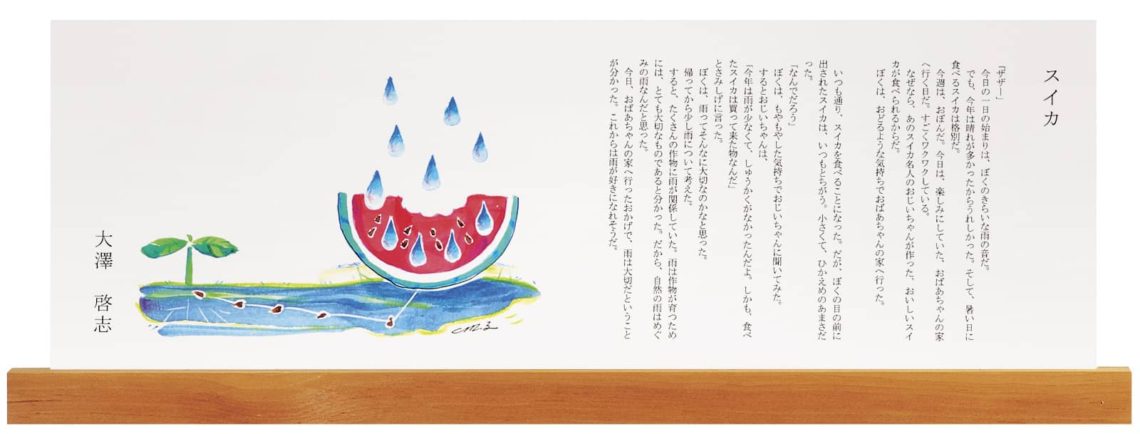 2015年度受賞作品, ARTIST, AWARD, ヤマザキタカシ, 未分類 【特別賞】スイカ 2022年9月1日 「ザザー」 今日の一日の始まりは、ぼくのきらいな雨の音だ。 でも、今年は晴れが多かったからうれしかった。そして、暑い日に食べるスイカは格別だ。 今週は、おぼんだ。今日は、楽しみにしていた、おばあちゃんの家へ行く日だ。すごくワクワクして いる。 なぜなら、あのスイカ名人のおじいちゃんが作った、おいしいスイカが食べられるからだ。 ぼくは、おどるような気持ちでおばあちゃんの家へ行った。 いつも通り、スイカを食べることになった。だが、ぼくの目の前に出されたスイカは、いつもとちが う。小さくて、ひかえめのあまさだった。 「なんでだろう」 ぼくは、もやもやした気持ちでおじいちゃんに聞いてみた。 するとおじいちゃんは、 「今年は雨が少なくて、しゅうかくがなかったんだよ。しかも、食べたスイカは買って来た物なんだ」 とさみしげに言った。 ぼくは、雨ってそんなに大切なのかなと思った。 帰ってから少し雨について考えた。 すると、たくさんの作物に雨が関係していた。雨は作物が育つためには、とても大切なものであると 分かった。だから、自然の雨はめぐみの雨なんだと思った。 今日、おばあちゃんの家へ行ったおかげで、雨は大切だということが分かった。だから、これからは雨が好きになれそうだ。 前 【奨励賞】やっと見られるんだね 最近 【特別賞】きれいな海を未来に こちらもおすすめ 【ざぶん環境賞】無人島で 2022年8月10日 【特別賞】いでざらえ 2022年6月6日 【ざぶん文化賞】日本の水道について 2022年10月5日 コメントを残す コメントをキャンセルメールアドレスが公開されることはありません。 ※ が付いている欄は必須項目です名前 ※ メール ※ サイト 次回のコメントで使用するためブラウザーに自分の名前、メールアドレス、サイトを保存する。 コメント