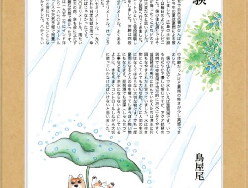 適になって、少し考えかたが変わったのだろうって言っていたわ。そのころから、少しずつだけど、住ん でいる周りの植物が増えて、水がきれいになったなって感じるようになってきたの。人間たちが、私たちの苦しみに気付いてくれたのか、もうすることがなくなってしまったのかはわからないけど、とにかく、 水の汚れは止まったの。