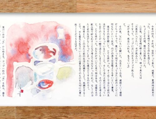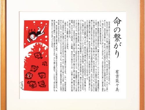 幼いころ、私は海が大好きでした。昔のアルバムを見ても海をバックにしたものが多く目に留まりま す。朝早く海へキス釣りへ出かけた父に朝ご飯のおにぎりを持っていったり、幼馴染みと一緒に白い砂 浜の山を素足で登ったりと、海ではとても大切な思い出がたくさんできました。