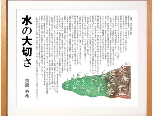 屋久島の自然は、僕に水の大切さを教えてくれました。水は僕たちが生きていくためには欠かせないものです。僕たち人間の身体も三分の二以上は水分でできています。水はとても大切ですが、日常生活の中では、水の大切さを忘れてしまいがちです。自然も人間も水無しでは生きていけません。人間が汚さなければ、水はとても美しいものです。僕は屋久島で学んだことをきっかけに、水と環境保護に関心を持ち、自分にできることをしていきたいです。